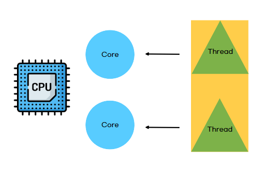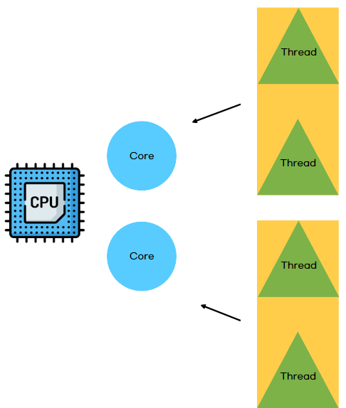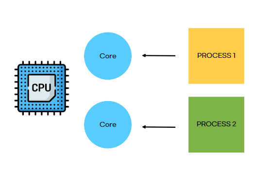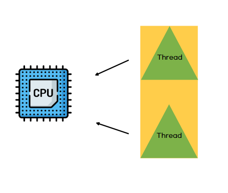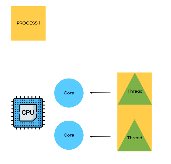 이제 스레드 2개를 가진 프로세스가, 2개의 코어를 가진 CPU에서 실행되면 각각 실행되게 됩니다. 이렇게 병렬적으로 실행되는 구조를 멀티스레딩(MultiThreading)이라고 하며, 이는 하나의 프로세스가 동시에 여러 작업을 실행하는데 목적을 두고 있습니다.