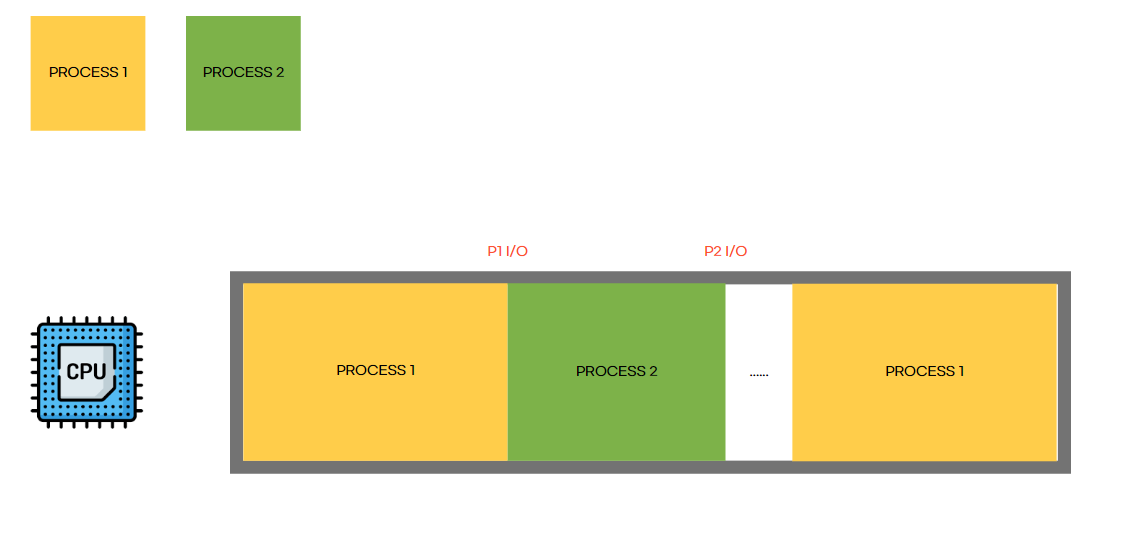 위 사진을 설명해 보겠습니다. 먼저, P1이 실행됩니다. 그러다 I/O 작업이 발생하여 CPU에서의 P1 작업이 종료되고 P2가 실행이 됩니다. P2도 I/O 작업이 발생하였지만 P1의 I/O 작업이 끝나지 않아서 CPU는 기다리고 있습니다. 그 뒤에, P1의 I/O가 작업이 종료되어서 P1이 다시 실행됩니다.