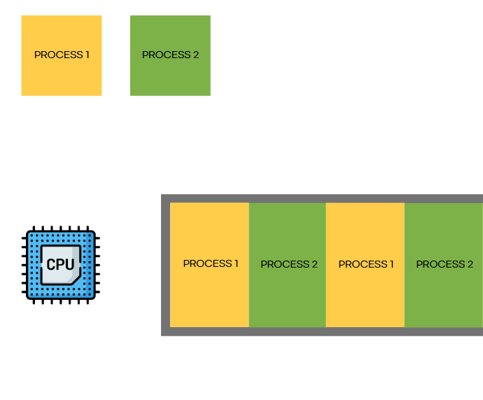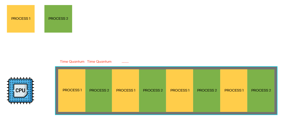 위의 사진처럼, P1과 P2가 번갈아가면서 짧은 시간만 CPU를 점유하는 방식입니다. 이렇게 하여 여러 프로세스가 동시에 실행되는 것처럼 보이게 함, 즉 프로세스의 응답 시간을 최소화시키는데 목적이 있습니다.