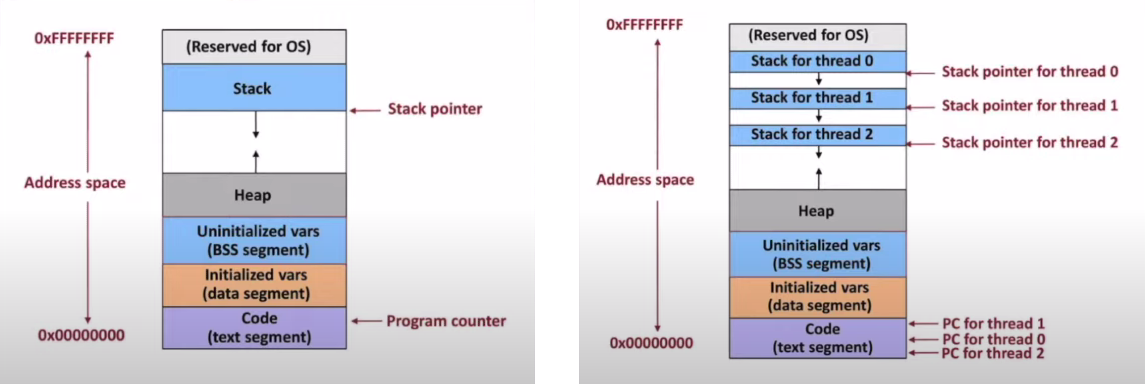 왼쪽이 Single Thread(혹은, Thread가 등장하기 전 process의 메모리 구조), 오른쪽이 Multi Thread일 때의 메모리 구조입니다. 사진은 각각의 프로세스가 할당받은 메모리 영역입니다. 각각 스택과 힙이 존재하는데, 멀티 스레드 구조에서 힙 지역은 공유하고 스택 지역은 각각 할당받는다는 점만 알고 넘어가겠습니다. 스택처럼 PC(Program Counter, 다음에 실행할 명령어의 주소)도 스레드 별로 존재합니다.