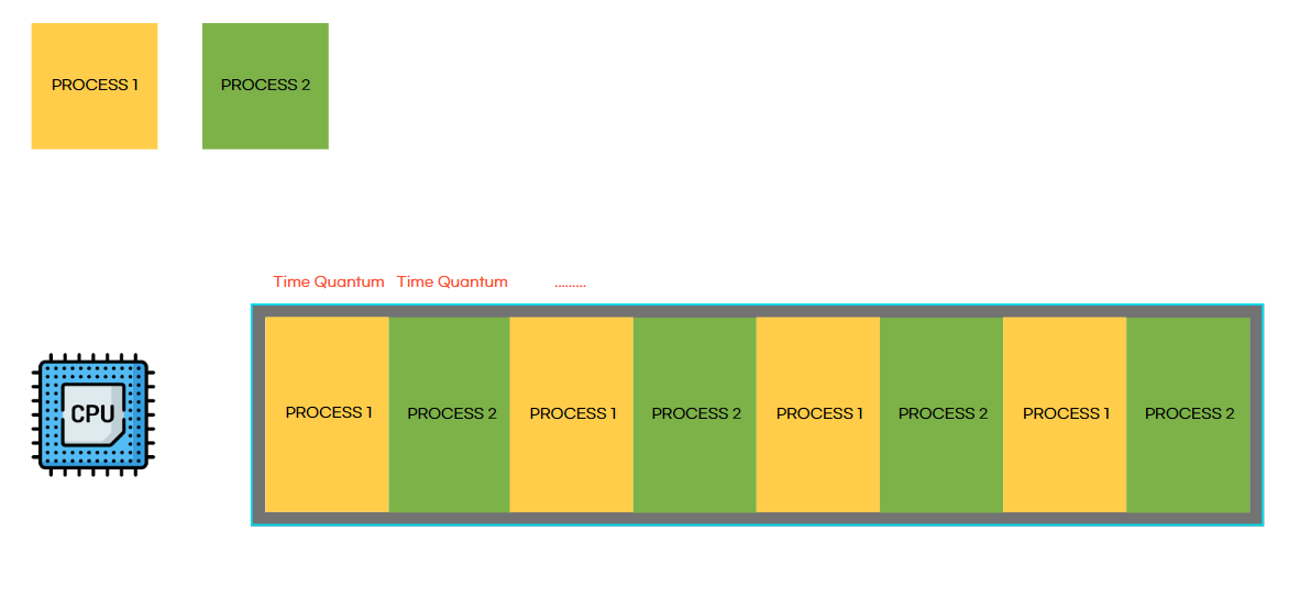 위의 사진에서 Time Quantum동안 프로세스 1,2가 번갈아가면서 실행되고 있습니다. 매우 짧은 시간 동안 번갈아가면서 실행되면서 동시에 실행되는 것처럼 보이게 됩니다. 이렇게 프로세스가 바뀌는 것을 '컨텍스트 스위칭' 이라고 합니다.
