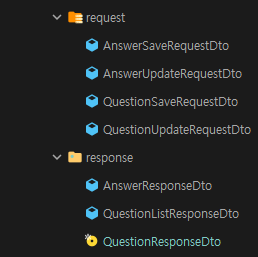 (저는 모든 요청과 응답이 원하는 데이터가 다르기 때문에 각각 DTO를 만들어야 한다고 생각해서 이런 식으로 구현합니다)