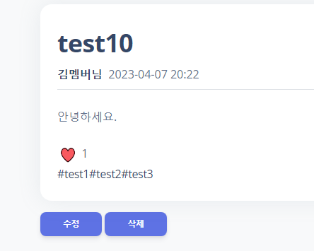 4. 최종적으로 글 작성을 한다면, 입력된 해시태그들이 list 형태로 입력됩니다.