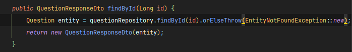 위에서 findById 메서드는 QuestionResponseDto를 반환하고, 이를 화면에 띄워주는 형식입니다. DTO에 필드를 추가하는 방식과, 게시글에 맞는 해시태그를 조회해 와서 view에 추가해 주는 방식 중에서 고민하였습니다.
